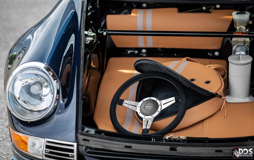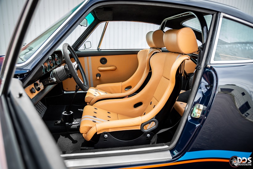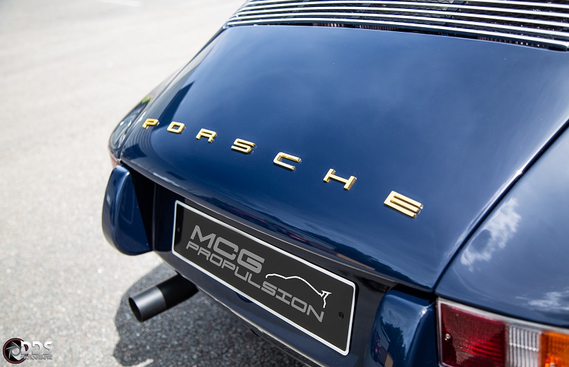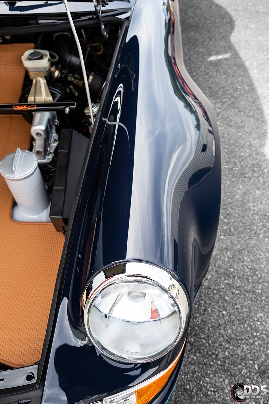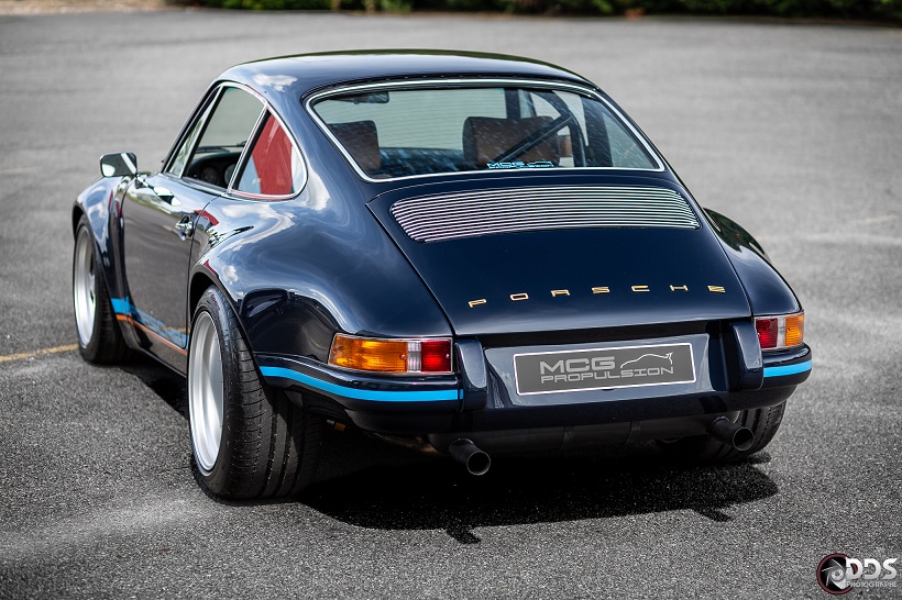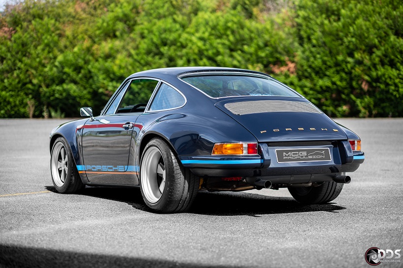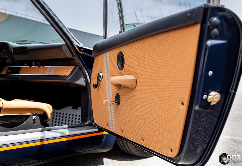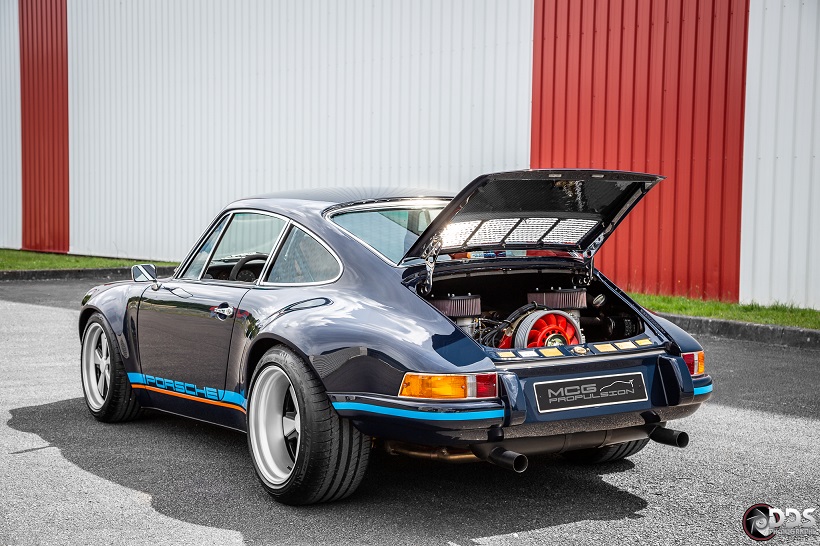 Backdating sur base 911 SC 3.0L. Suppression du toit ouvrant et des gouttières de toit, ailes arrières tôle formées à la main galbe spécial MCG, ailes avant fibre galbe spécial MCG, pare choc fibre style 2.5 ST avec lèvre, bas de caisses spécifiques intégrant les conduites d’huile, capot AV et AR en carbone, phares Led, sièges AV spécifiques MCG en fibre, volant démontable avec sa housse de transport, ciel de toit en Alcantara, arceau RSR 4 points arrière, Moteur 3L6 carbu PMO 320 cv, 1084 kgs, etc.