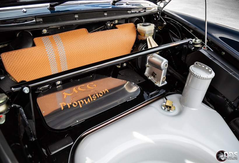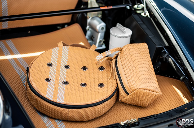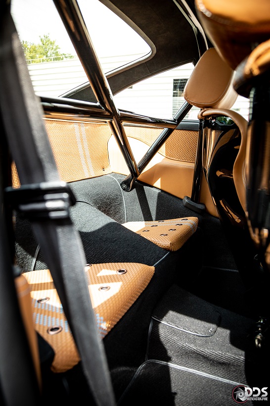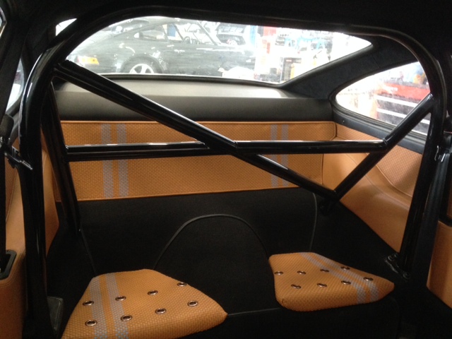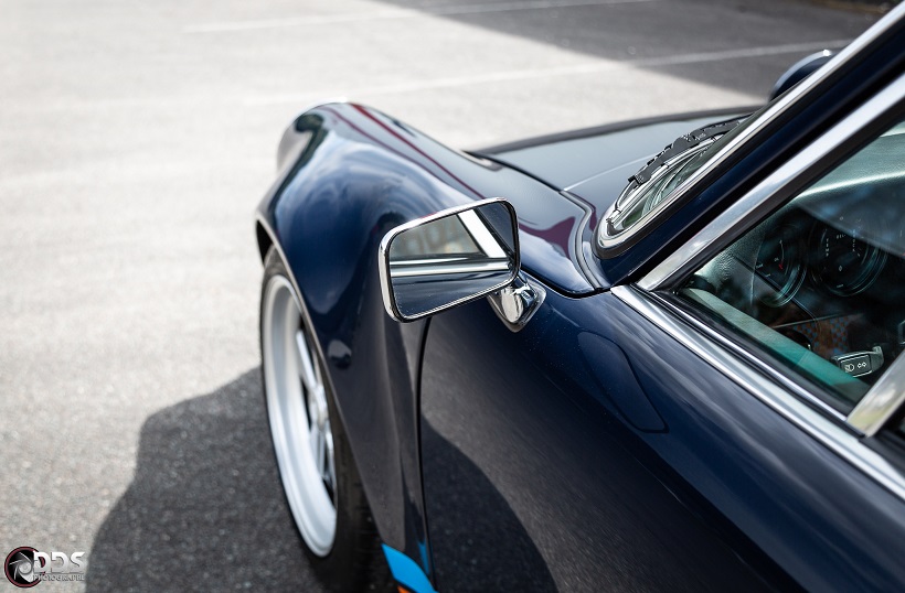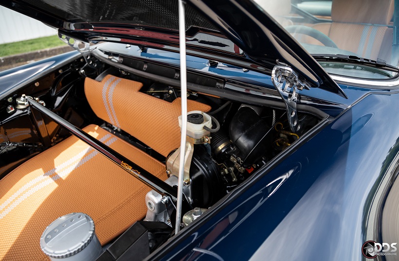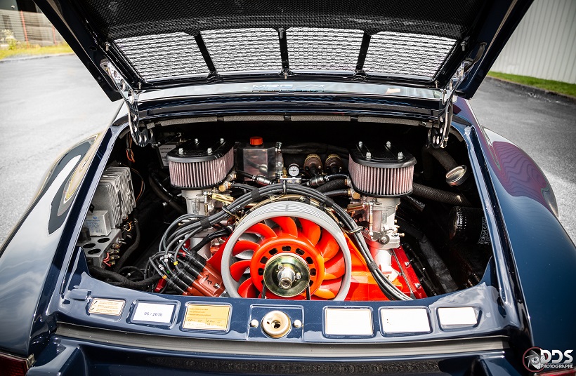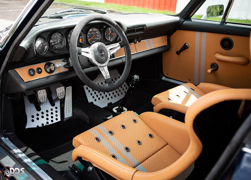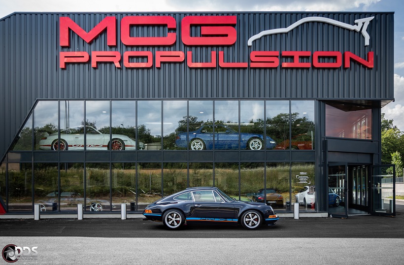 Backdating sur base 911 SC 3.0L. Suppression du toit ouvrant et des gouttières de toit, ailes arrières tôle formées à la main galbe spécial MCG, ailes avant fibre galbe spécial MCG, pare choc fibre style 2.5 ST avec lèvre, bas de caisses spécifiques intégrant les conduites d’huile, capot AV et AR en carbone, phares Led, sièges AV spécifiques MCG en fibre, volant démontable avec sa housse de transport, ciel de toit en Alcantara, arceau RSR 4 points arrière, Moteur 3L6 carbu PMO 320 cv, 1084 kgs, etc.