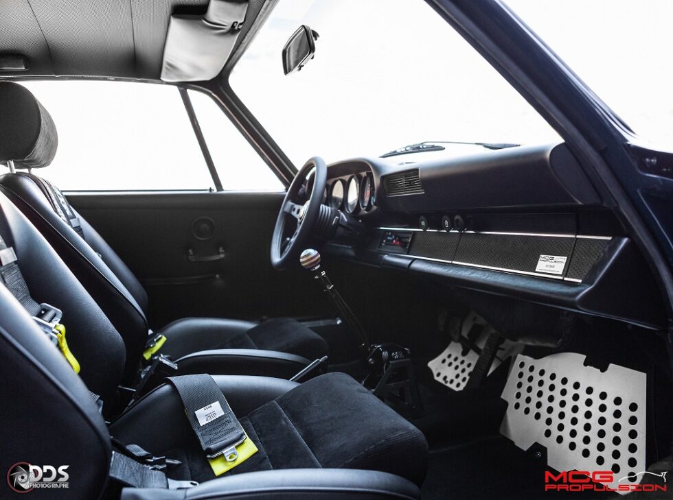 Couleur Gris Craie, Pare-chocs avant/arrière & capot en polyester, Ailes avant modifiées, Levier rehaussé, Moquette RS & sièges Classix en tissu, Moteur 3.2L avec arbres à cames sport, Boîtier reprogrammé - env. 245 ch, Echappement SSI, Châssis sport, Freinage amélioré avec étriers avant de 964