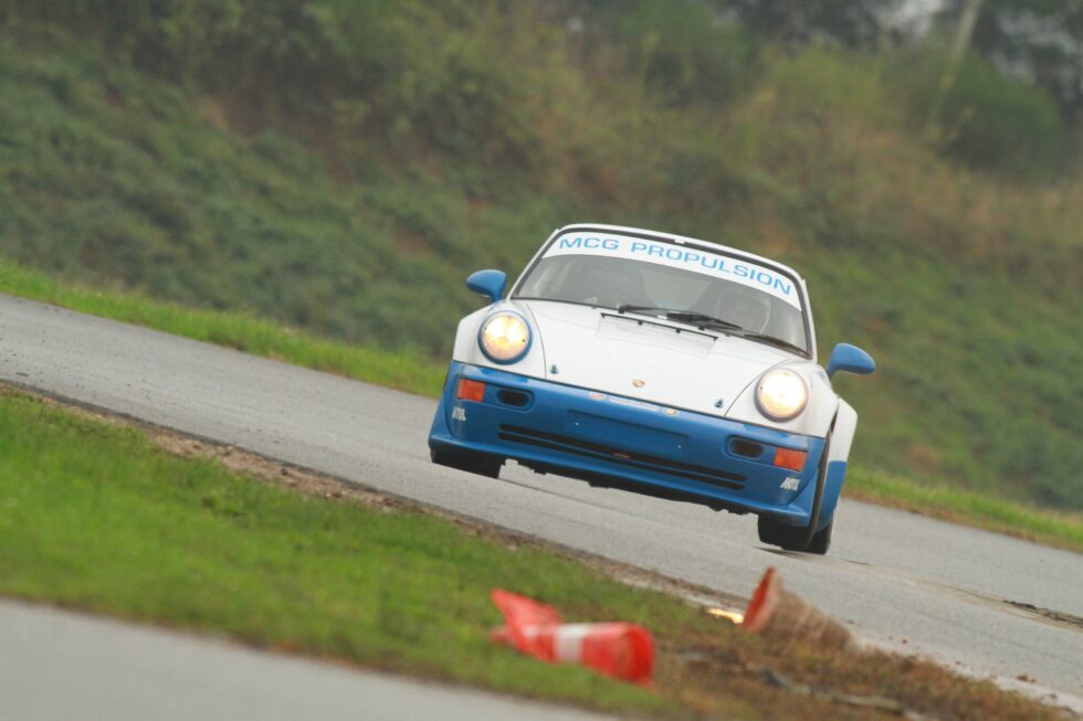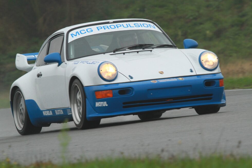 Cette première réalisation de MCG sur base 2L7, a été préparée pour le circuit. Moteur CUP 3L8 de plus de 310cv, boite 964RS pont, court, gros freins, suspensions RSR, arceau cage spécifique, poids optimisé à 950 kgs. Efficacité redoutable. Cette voiture a remporté plusieurs podium en championnat Endurance VHC.