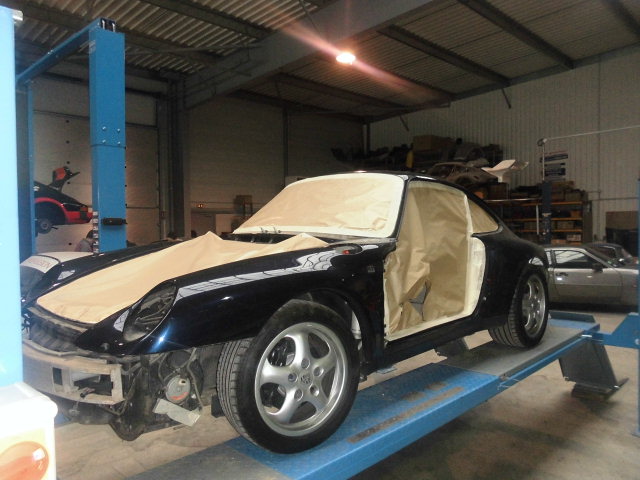 Transformation 993 Bi Turbo en look 993 GT2 (GT), changement de couleur complet en blanc, pas de modifications sur l'intérieur et le moteur.